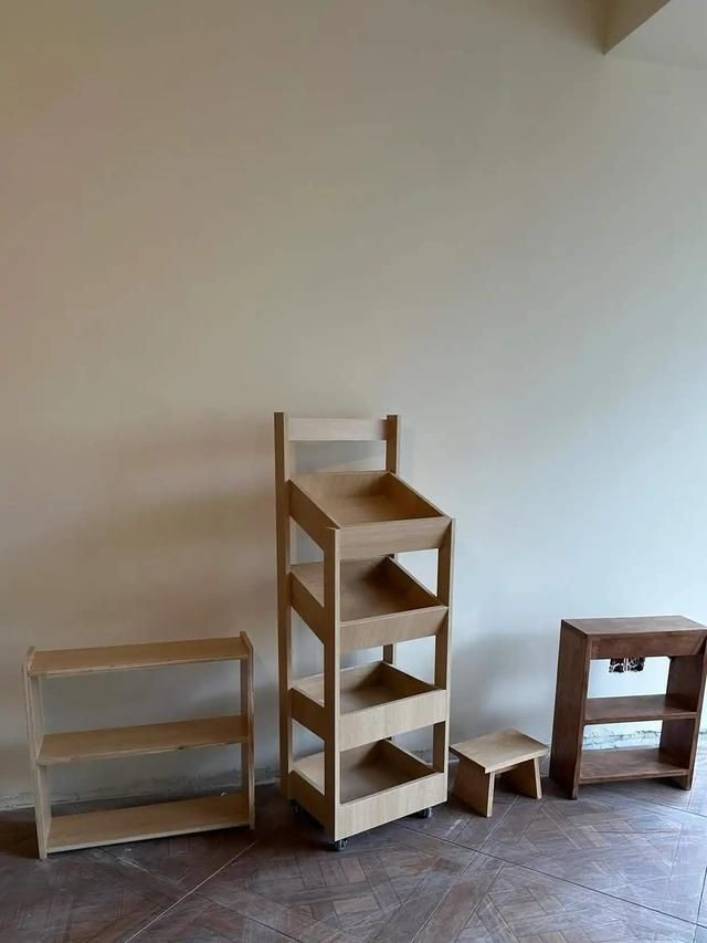 让师傅现场帮忙切好木料,打好磨边,拼成3个木凳,和木地板的色调完美契合,又实用又有料。
