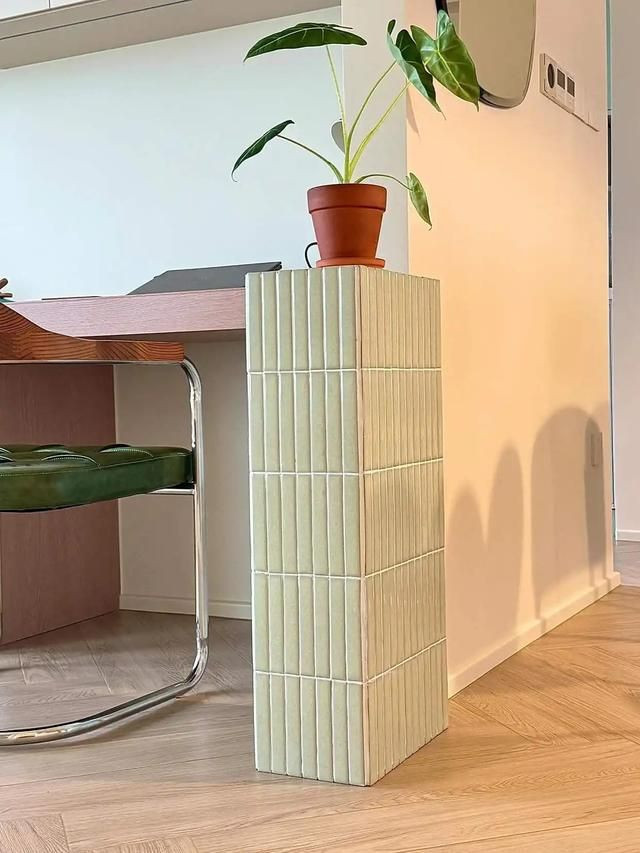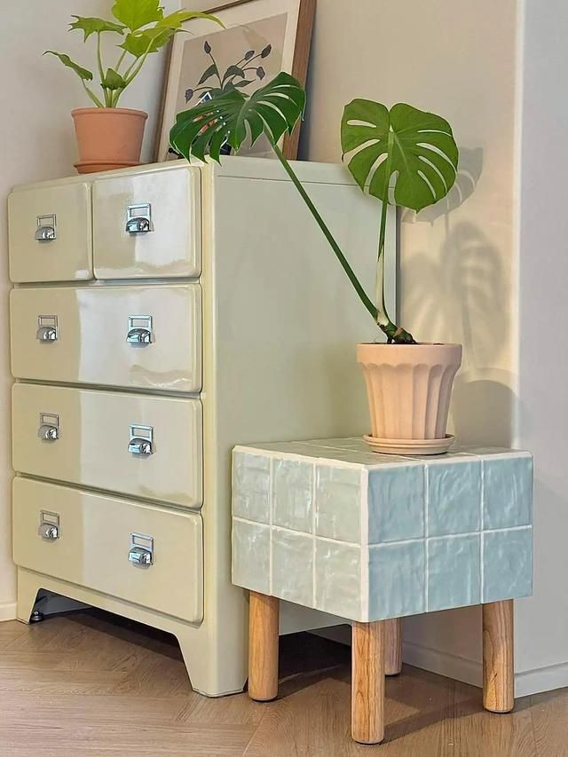 瓷砖碎片搭配木箱,用结构胶粘贴成边几或置物架,看似普通,却特别实用。绿植、摆设、书本,都能放在上面,颜值直接飙升!