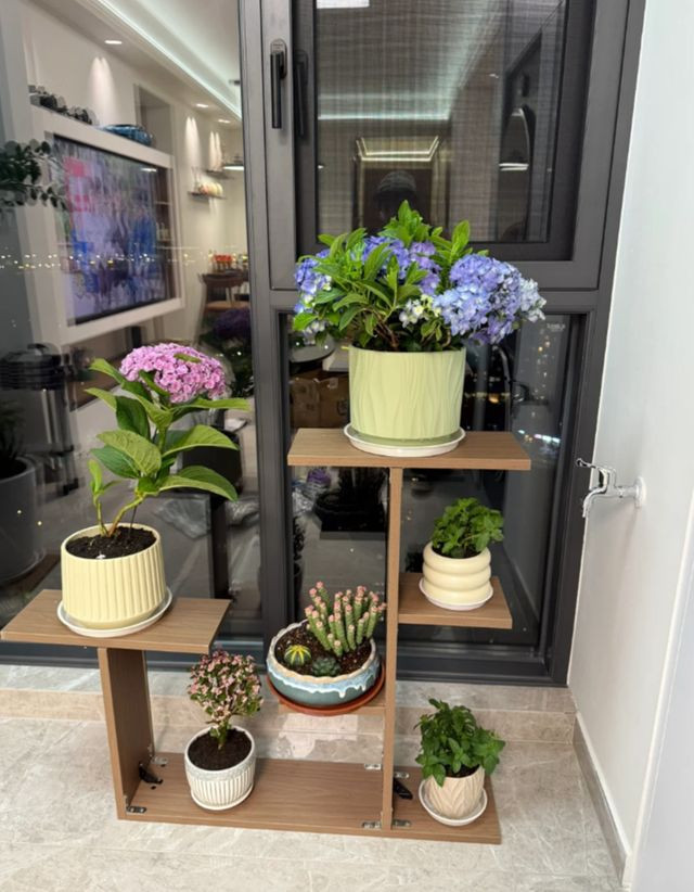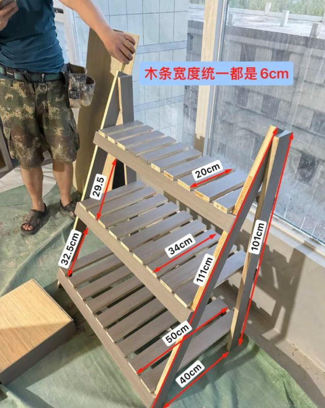 装修后剩下的木料,全部交给巧手木工师傅,帮忙做了个漂亮的花架、几个小板凳,还有一个杯架。